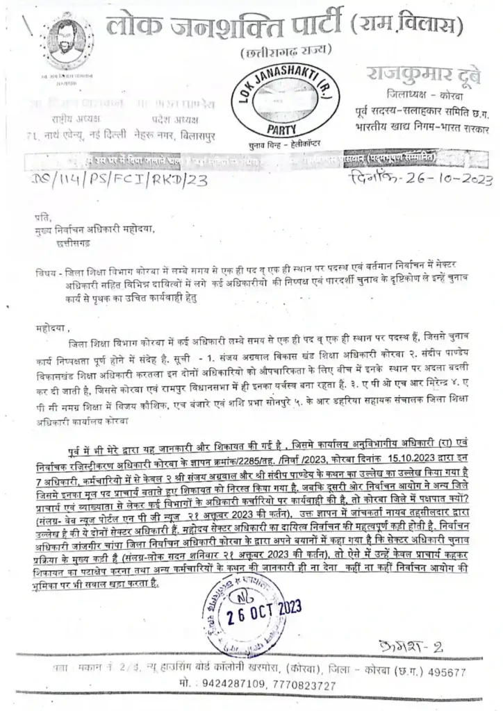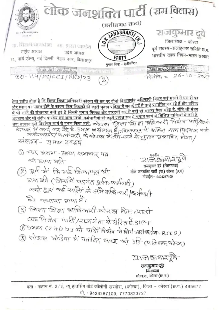 ऐसा प्रतीत हो रहा है, विकास खण्ड शिक्षा अधिकारी कोरबा एवं करतला विगत कई सालों से अपने पद पर एक ही जगह पर जमे हुए हैं, और कहीं ना कहीं जिला शिक्षा अधिकारी जो भ्रष्टाचार में आकंठ डूबा हुआ है, अपनी आर्थिक स्थिति इन्हीं लोगों के सहयोग से मजबूत कर रहा है, ऐसा प्रतीत होता है, तमाम शिकायत एवं आरोप के बाद भी अधिकारी व कर्मचारी का एक ही जगह जमा रहना भी कहीं ना कहीं निर्वाचन प्रक्रिया पर सवाल खड़ा करता है, क्योंकि दोनों विकास खंड शिक्षा अधिकारी के अधीनस्थ में हजारों शिक्षक कार्य कर रहे हैं, और उन्ही शिक्षकों की ड्यूटी निर्वाचन में लगी है, जिससे ऐसा प्रतीत होता है, कि कहीं ना कहीं इन्हीं विकासखंड शिक्षा अधिकारियों के भरोसे कुछ विशेष पार्टी व राजनेता विशेष के पक्ष में मतदान को संपन्न कराने की तैयारी जिला प्रशासन/जिला निर्वाचन कोरबा कर रहा है, लोक जनशक्ति पार्टी (रा.) कोरबा के जिला अध्यक्ष के द्वारा की गई शिकायत के निराकरण के नाम पर षडयंत्र पूर्वक कुछ अधिकारी व कर्मचारी तथ्य विहीन कंडिका लिखकर आरोपियों को बचाने का कार्य किए हैं, दुबे जी ने पारदर्शी व निष्पक्ष पूर्ण कार्यवाही न होने से व्यथित होकर राज्य निर्वाचन अधिकारी श्रीमती रीना बाबा साहब कंगाले के कार्यालय में लिखित शिकायत मय प्रमाण सहित पेश की है,और कार्यवाही की मांग की गई है, राजकुमार दुबे ने कहा कि यदि तत्काल कोई उचित कार्रवाई नहीं की गई तो इसकी शिकायत राष्ट्रीय निर्वाचन आयोग भारत सरकार से भी की जाएगी, आखिर जिला शिक्षा अधिकारी वह जिला निर्वाचन अधिकारी/कलेक्टर कोरबा कई सालों से एक ही पद और स्थान पर जमे अधिकारियों, कर्मचारियों को निर्वाचन से अलग क्यों नहीं कर रहा है या उनका अन्यत्र हस्तांतरण क्यों नहीं किया जा रहा है,यह समझ के पड़े हैं, और निर्वाचन प्रक्रिया पर सवाल भी खड़ा करता है,